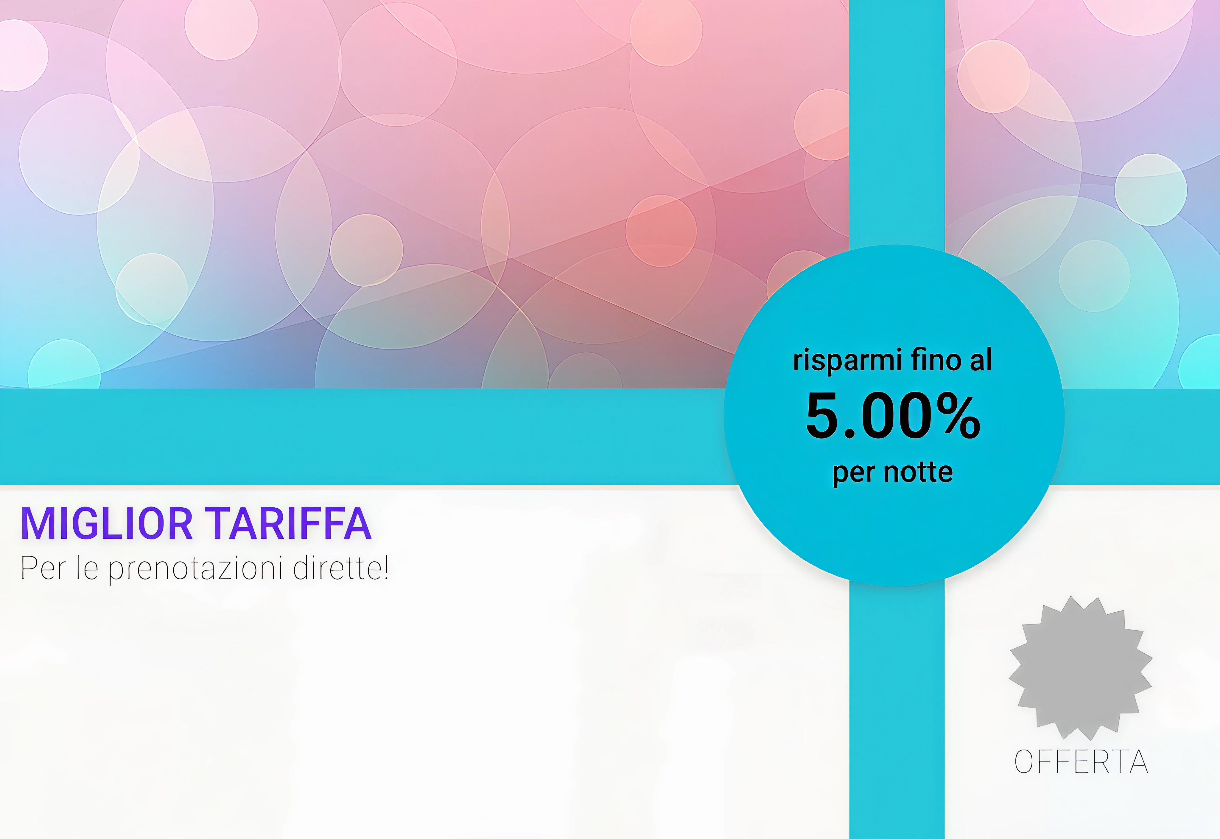 Per ottenere lo sconto è sufficiente prenotare direttamente dal nostro sito ufficiale cliccando sul bottone azzurro PRENOTA ORA, scegliendo le date del tuo soggiorno, il numero di ospiti e completando in autonomia la procedura di prenotazione qua sul nostro sito oppure effettuare direttamente con noi una prenotazione contattandoci al telefono o tramite e-mail diretta, o dal form RICHIEDI PREVENTIVO, senza l’utilizzo di intermediari.