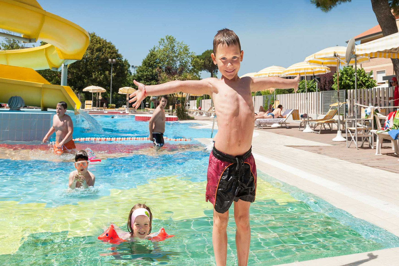 Per i più piccoli abbiamo realizzato una piscina per bambini colorata, con acqua bassa e area giochi dedicata, ideale per giocare in sicurezza e divertirsi in compagnia.